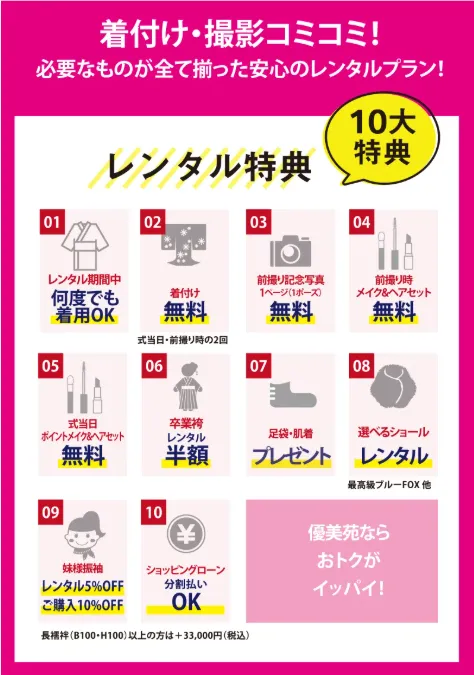優美苑きものにじいろでは、お客様のご要望に合わせた、様々な振袖プランをご用意しております。